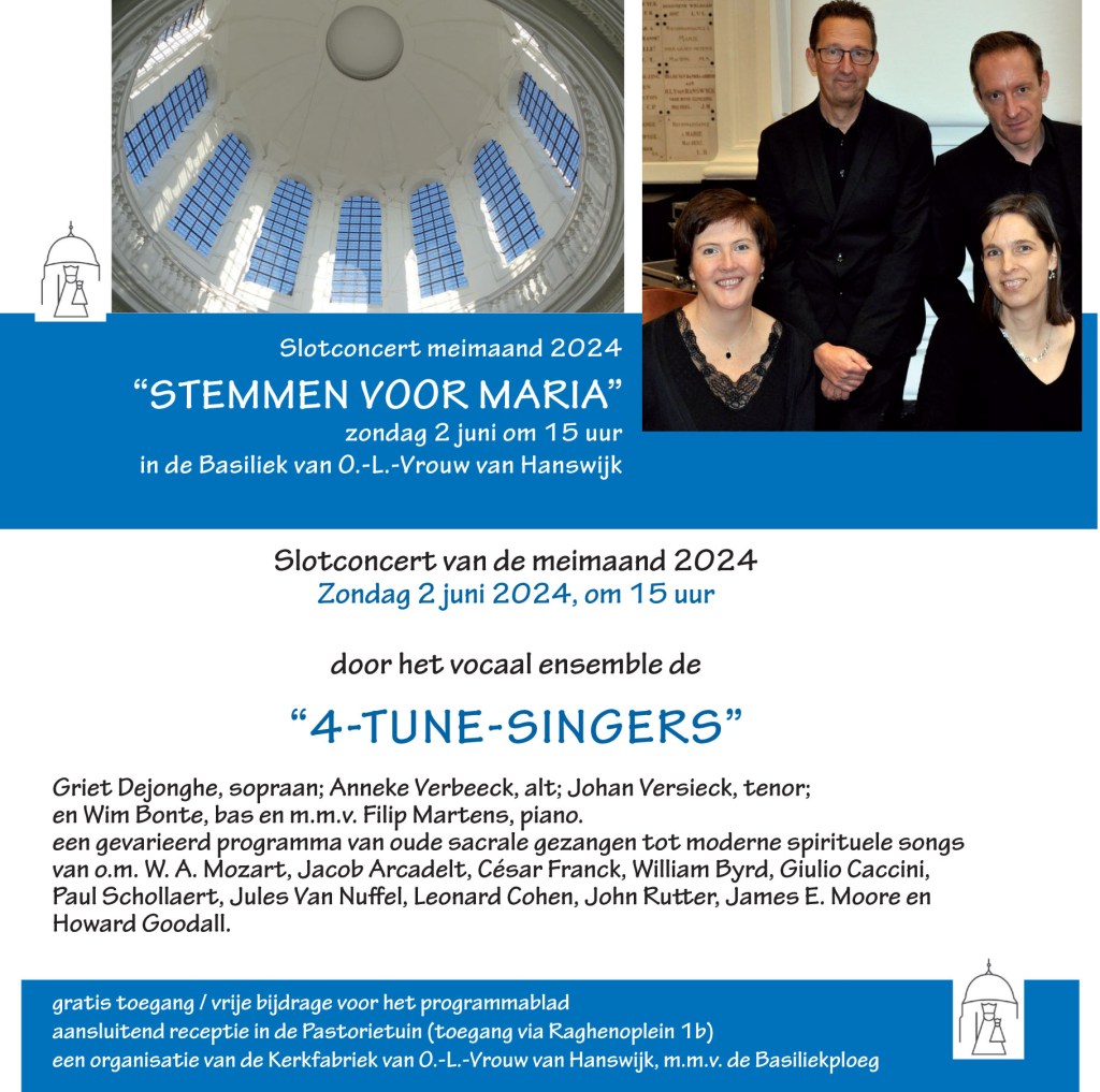 U bent dus van harte welkom in onze Hanswijkbasiliek op zondag 2 juni om 15.00 u. voor dit gevarieerd bezinningsconcert met de “4-Tune-Singers”, rond het beeld van Onze-Lieve-Vrouw van Hanswijk