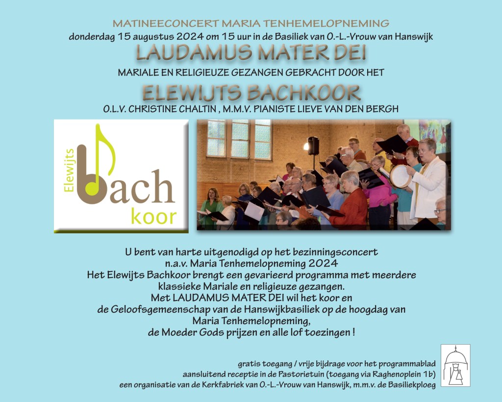 Op het hoogfeest van Maria Tenhemelopneming, op donderdag 15 augustus 2024 om 15u, zal in de Hanswijkbasiliek weer een bezinningsconcert plaatsvinden. Deze keer is het Elewijts Bachkoor te gast, onder leiding van dirigente Christine Chaltin en met Lieve Van Den Berghe als begeleidster aan de piano.